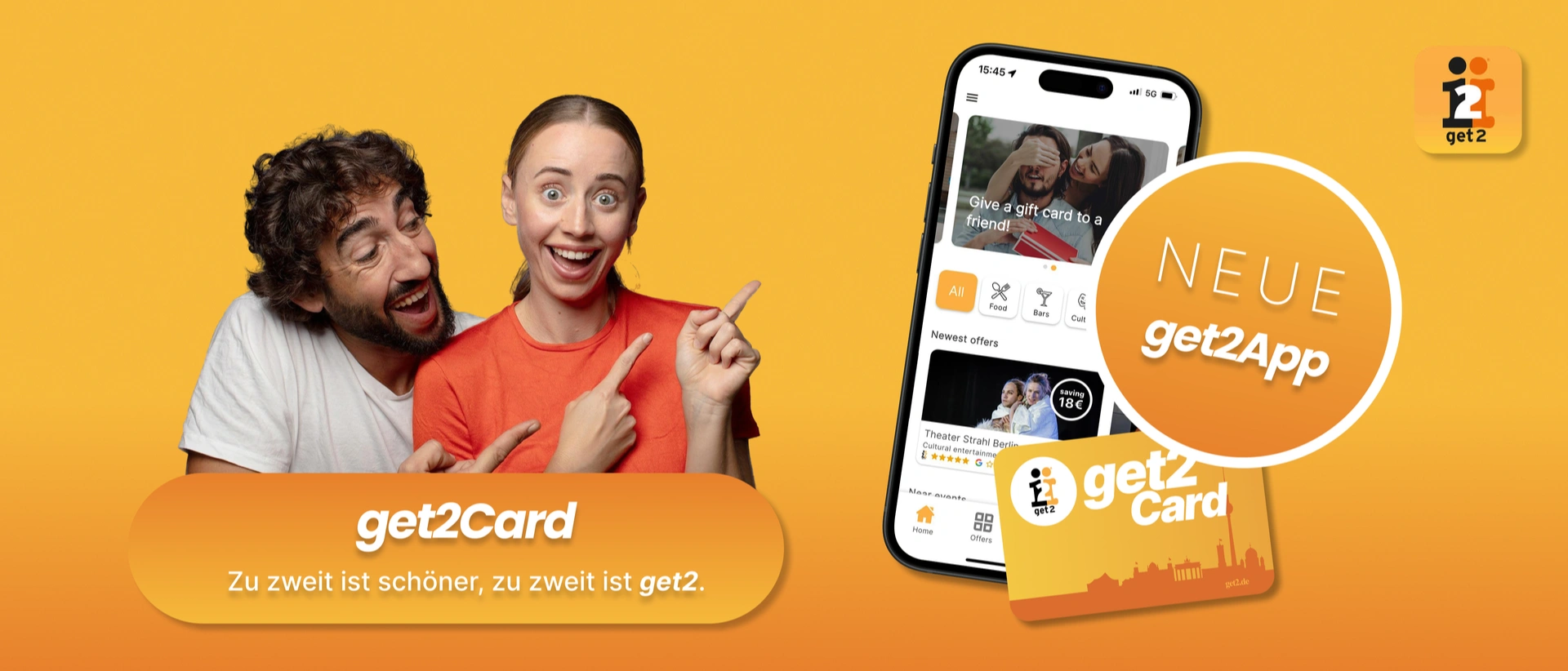get2Card ist ein erprobtes 2-für-1-Marketing-& Freizeitsystem. Mitglieder zahlen ein Abo und entdecken laufend neue Restaurants, Theater und Freizeitangebote, immer mit dem Vorteil: zwei nutzen, einer zahlt. Das schafft Erlebnisse, Abwechslung und echte Mehrwerte.